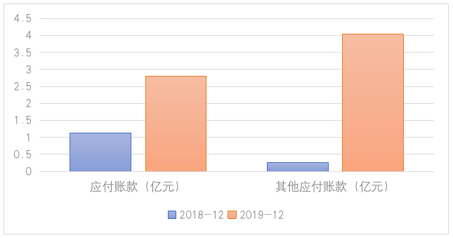 除此之外,“买买买”战略也让爱迪尔负债压力突增,资金链也愈发紧张。2019年爱迪尔的应付账款和其他应付账款分别较上一年增长1.73亿元和3.78亿元,同比增幅分别高达146.90%和154.98%。