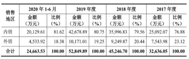 从销售区域来看,目前星华反光以国内市场为主,营收约占总收入占比的80%。据招股书显示,报告期内,星华反光的外销业务收入分别为7543.98万元、9249.87万元、1.02亿元和4533.92万元,占该公司主营业务收入的比重分别为23.12%、20.44%、19.25%和18.38%,呈下降趋势。