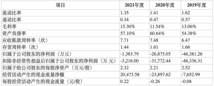 数据显示,2019年至2021年,该公司营业收入分别为46.28亿元、44.94亿元及44.74亿元,较上期同比变化分别为-2.15%、-2.89%及-0.44%;归母净利润分别为-4.64亿元、-2.69亿元、-1.38亿元,较上期同比变化分别为-300.52%、42.06%、94.85%;扣非归母净利润分别为-4.63亿元、-3.18亿元、-3.22亿元。