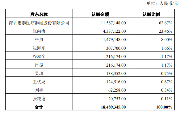 根据上海宏桐2021年度报告显示,公司股东为惠泰医疗、张向梅、上海惠上企业管理咨询中心(有限合伙)(下称上海惠上)、沈海东,认缴出资额分别为1158.71万元、363.62万元、295.83万元、30.77万元,认缴出资比例分别约为62.67%、19.67%、16%、1.66%。