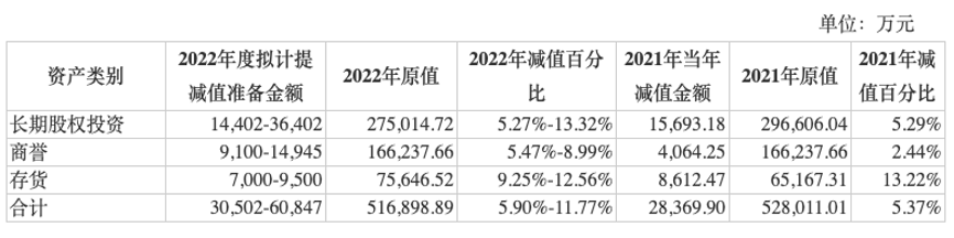 在回复中,华谊兄弟详细阐释了2022年度计提资产减值损失的资产类别及拟计提的减值准备金额。其中,长期股权投资的拟减值准备金额是最高的,达1.4亿元至3.64亿元。在上述基础上,加上商誉减值和存货减值,资产拟计提减值准备金额总计为3.05亿元至6.08亿元,相较2022年资产原值的51.69亿元,减值幅度为5.90%-11.77%。对比2021年的资产减值情况,2021年的资产原值为52.80亿元,减值幅度为5.27%。不难看出,2022年的拟资产减值幅度是进一步加大的。