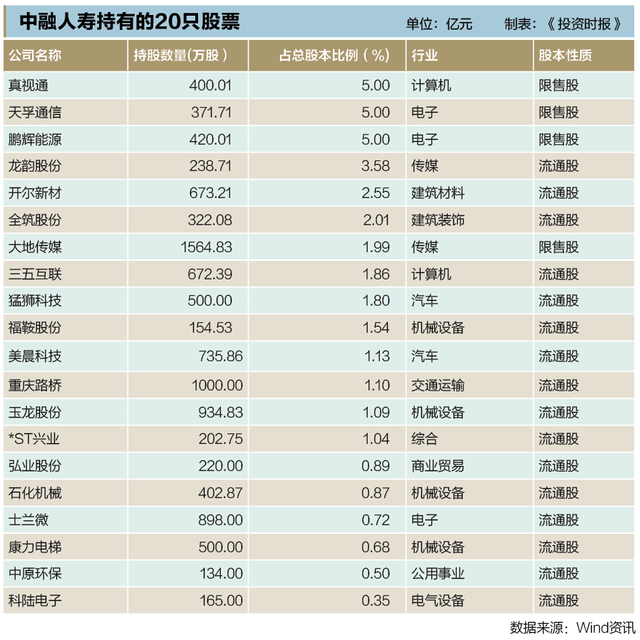除了上述三家公司,《投资时报》记者发现,截至去年三季度末,中融人寿还出现在17家公司的股东当中,包括开尔新材、美晨科技、全筑股份、福鞍股份、龙韵股份等,基本都是通过万能险和分红险持有。