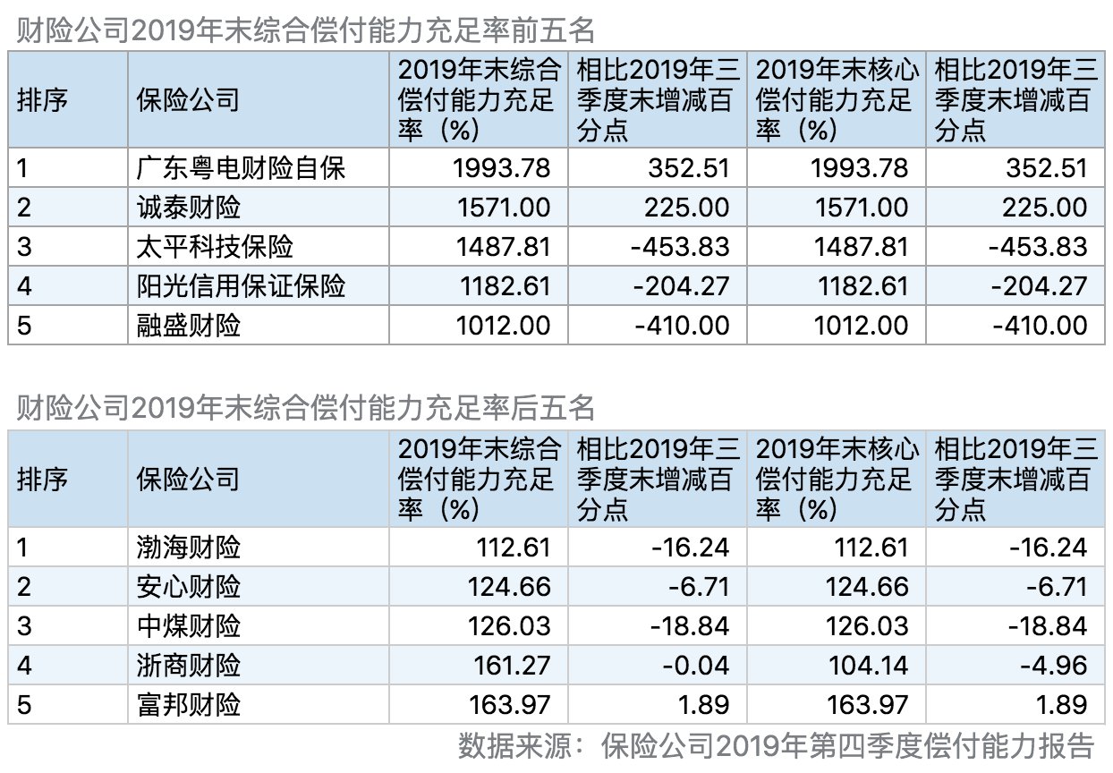 从财险公司偿付能力变化来看,《中国保险公司偿付能力报告·2019》显示,2019年四季度末,77家财险公司的平均综合偿付能力充足率为401.02%,平均核心综合偿付能力充足率为395.69%,环比均小幅下滑。2019年三季度末,上述两个指标的平均值分别为404.89%和399.77%。