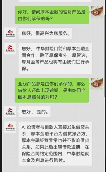 有出借人提供的截图显示,当出借人问询,“全线产品都是由你们承保的,那么借款人还款出现逾期,是由你们全额本息赔付的对吗?”中华财险客服回复“是的”,如果出现借款逾期,“在保险合同约定范围内,中华财险就本金及利息进行赔付。”