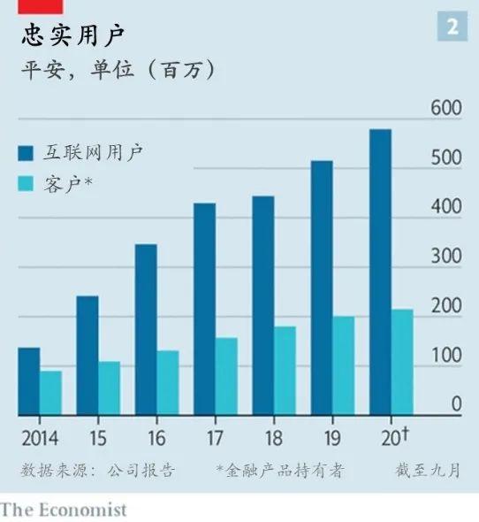 通过让上亿人使用其产品,平安建立了一个庞大的用户群,可以针对性地销售更复杂的产品。今年前9个月,平台使用者突破5.78亿(见表2)。其中,与平安有合同协议的客户约2.14亿人。其余的则被视为用户。今年上半年,1800万新客户中,约35%来自于用户。随着平安赢得更多的用户,这一比例近年来稳步上升。