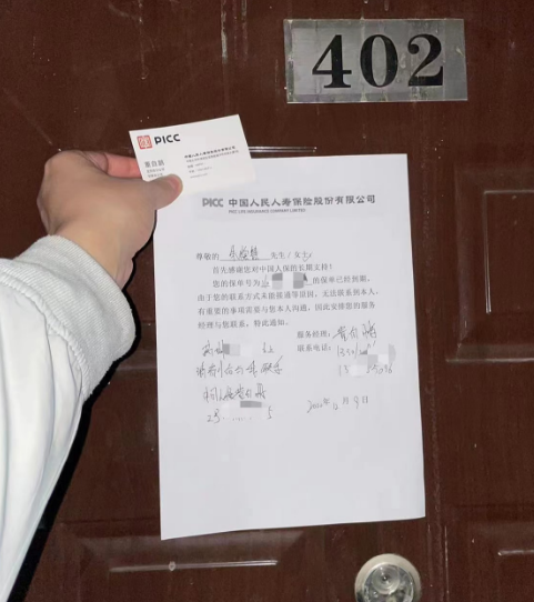 考虑到客户留下的是家庭地址,董经理特意安排12月9日(周五)傍晚出发,当他驱车从北京城里赶到顺义区客户家时,还是遇到了“铁将军”把门。于是,他按照提前想好的预案留下写明来意的字条并附上自己的名片贴在客户家门上。随后与居委会和物业取得联系说明情况,请求帮助查找客户信息。在居委会和物业的帮助下,董经理终于联系上了正在国外出差的客户,并指导客户通过人保寿险E服务一步一步完成领取操作,客户为董经理的执着和认真竖起了大拇指,不仅感动于董经理在疫情下,不惧风险主动为自己办理领取手续的温暖与责任心,更为人保寿险员工的执着与认真所感动。