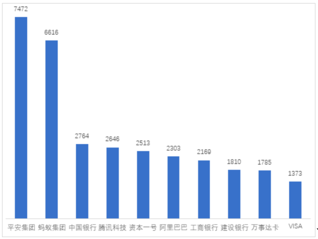 2018年~2022年10月期间全球企业金融科技专利申请数量TOP10
