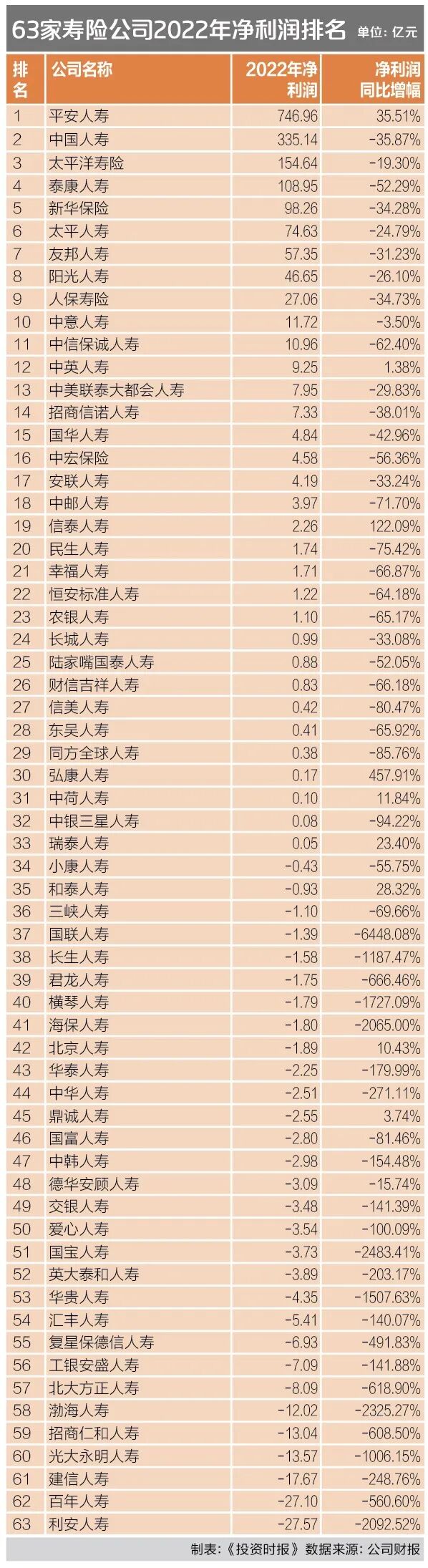 通过对63家寿险公司2022年净利润进行梳理分析,标点财经研究院联合《投资时报》推出《中国寿险业盈利榜》。
