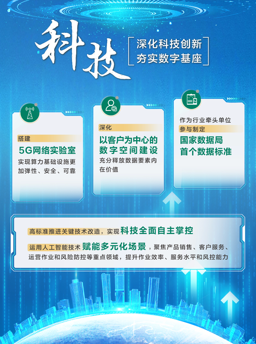 科技创新多点开花。高标准推进关键技术改造,实现科技全面自主掌控。运用人工智能技术赋能多元化场景,聚焦产品销售、客户服务、运营作业和风险防控等重点领域,提升作业效率、服务水平和风控能力,为公司高质量发展注入强劲动力。