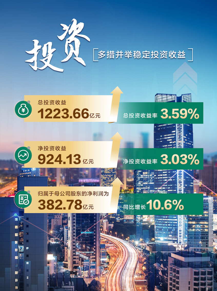 努力稳定整体收益水平。该公司将资产负债管理理念贯穿经营管理各环节,积极兼顾长期价值和短期效益,持续加强成本管控和承保管理。2024年上半年,总投资收益为1223.66亿元;归属于母公司股东的净利润为382.78亿元,同比增长10.6%。