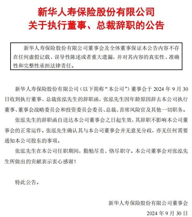 2024年9月30日,新华保险公告,该公司董事会于当日收到执行董事、总裁张泓的辞职函,张泓因年龄原因辞去新华保险执行董事、董事会战略委员会和投资委员会委员、总裁、首席风险官及其他一切职务。
