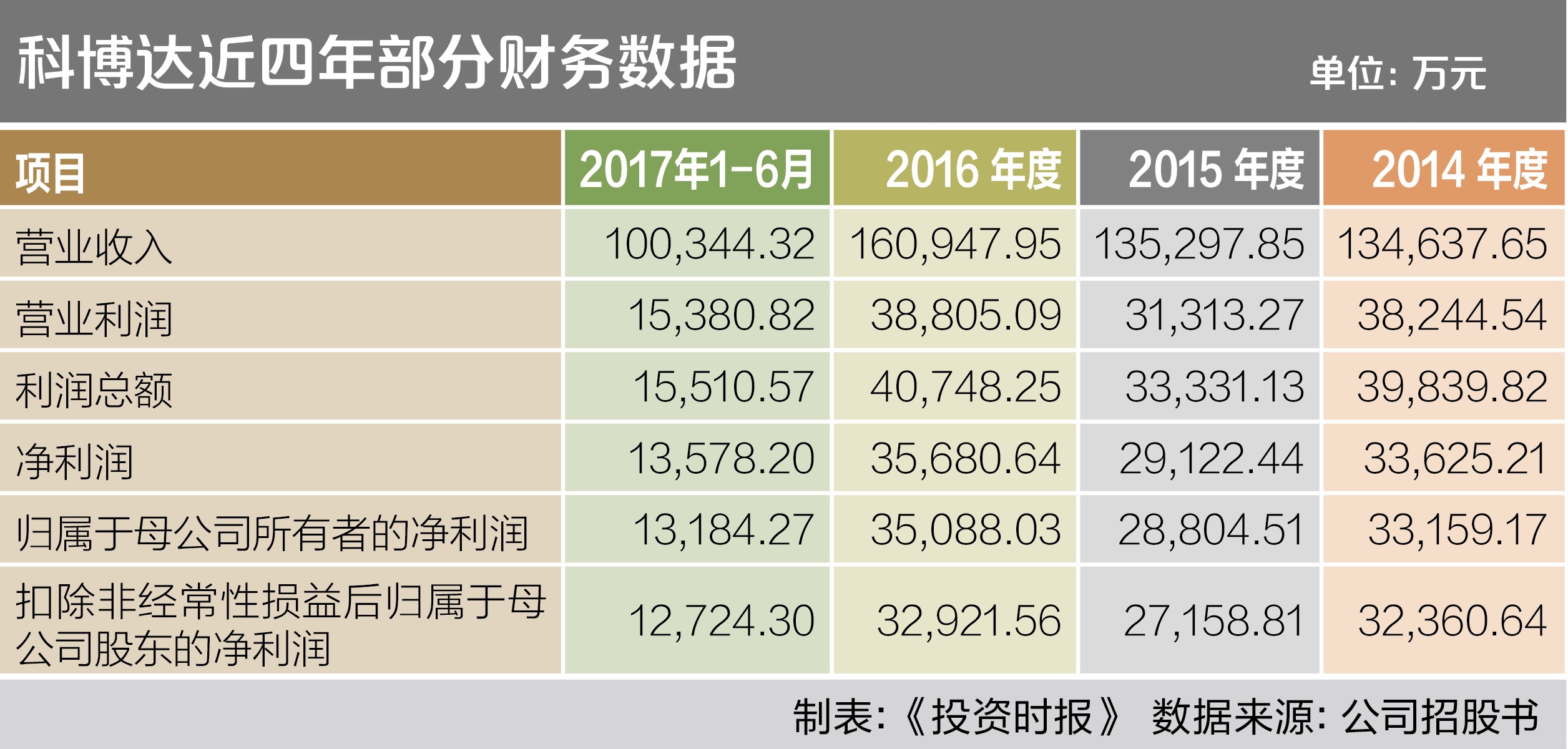2014—2016年和2017年1—6月(下称报告期),科博达实现营业收入分别为13.46亿元、13.53亿元、16.09亿元和10.03亿元,同期净利润为3.36亿元、2.91亿元、3.57亿元和1.36亿元,公司主营业务综合毛利率分别为42.12%、37.67%、37.67%及32.35%。科博达解释称,受产品结构调整、汇率波动等因素的影响,公司报告期内毛利率有所下降。