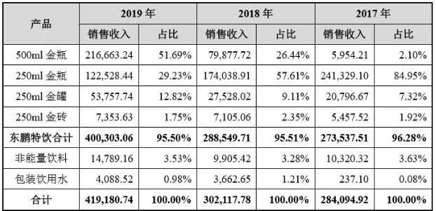 报告期内,东鹏饮料营业收入分别为28.44亿元、30.38亿元和42.09亿元,呈现逐年攀升趋势。其中2018年度和2019年度同比增长6.82%和38.55%。同期,该公司的净利润分别为2.96亿元、2.16亿元和5.71亿元,2018年度同比下降27.03%,出现增收不增利现象。