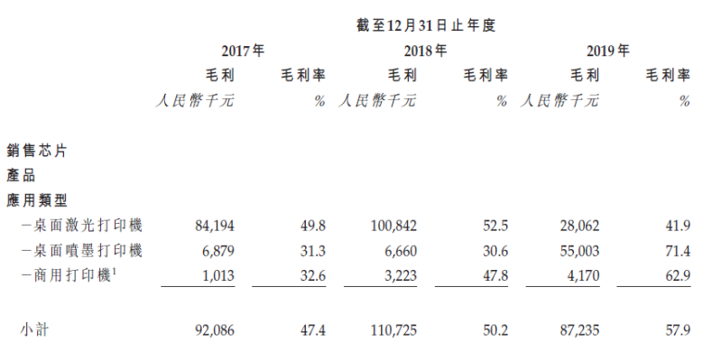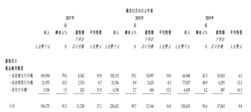 查阅招股书《投资时报》研究员发现,前述提到的产品价格下降,主要表现在桌面激光打印机,与之相反2019年该公司桌面喷墨打印机价格上升明显,且销量显著增加,这主要是由于2019年该公司成功开发并销售某些型号高质量且功能良好的桌面喷墨打印机芯片,带来了可观盈利,2019年该公司桌面喷墨打印机芯片业务毛利率翻了一番,达到71.4%。