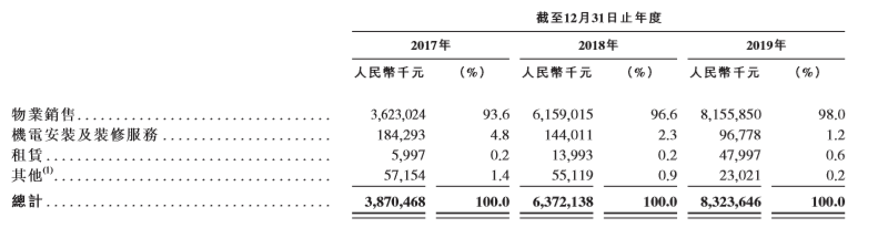 查阅招股书,《投资时报》研究员发现,报告期内,实地地产的收益主要集中于物业销售,此外,有小部分收益来自机电安装及装修收益及自租赁赚取租金收入,该公司亦自设计咨询服务及建材贸易赚取收入。报告期内,实地地产物业销售收益分别为36.23亿元、61.59亿元、81.56亿元,分别占同年总收益93.6%、96.6%及98.0%。