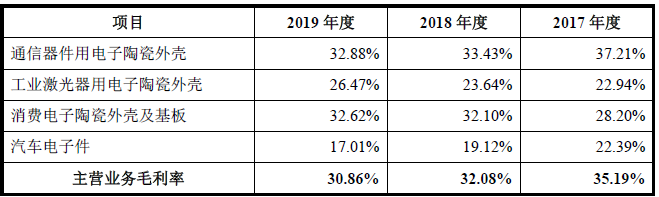 针对通信器件用电子陶瓷外壳毛利率下降,招股书给出的解释为,通信器件用电子陶瓷外壳单位售价的增长百分比低于单位成本增幅,导致产品毛利率略有下降,这是公司“先以高毛利率进入市场,再降低毛利率以开拓市场”销售策略的体现。