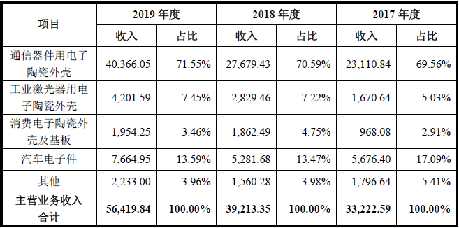 据了解,中瓷电子主要经营电子陶瓷系列产品,重点产品包括通信器件用电子陶瓷外壳、工业激光器用电子陶瓷外壳、消费电子陶瓷外壳及基板、汽车电子件等。2017—2019年(下称报告期),通信器件用电子陶瓷外壳销售收入基本稳定占到该公司主营业务收入的70%左右,是中瓷电子的主要收入来源。