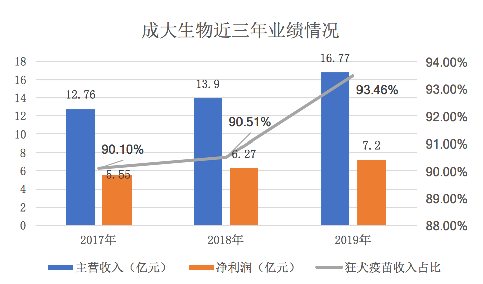 招股书资料显示,2017至2019年(下总称为报告期),成大生物主营业务收入分别12.76亿元、13.9亿元、16.77亿元,净利润达到5.55亿元、6.27亿元、7.2亿元。