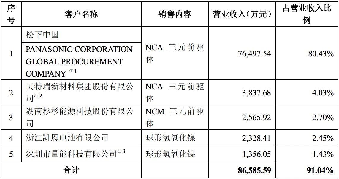 此外,报告期内,芳源环保前五大客户销售收入占当期营业收入的比例不断攀升,分别高达56.26%、87.28%和91.04%。而仅来源于大客户松下的销售收入就分别高达0.63亿元、4.86亿元和7.65亿元,占公司营业收入比例也由2017年的32.82%飙升至2019年的80.43%。