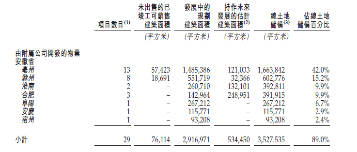 该公司业务主要集中于安徽地区。其曾于2018年开始在全国范围拓展物业开发项目,并逐步将业务拓展至山东及江苏地区。但资料显示,报告期内,该公司全部销售收入均来自于安徽并且目前总土地储备近90%都位于安徽。