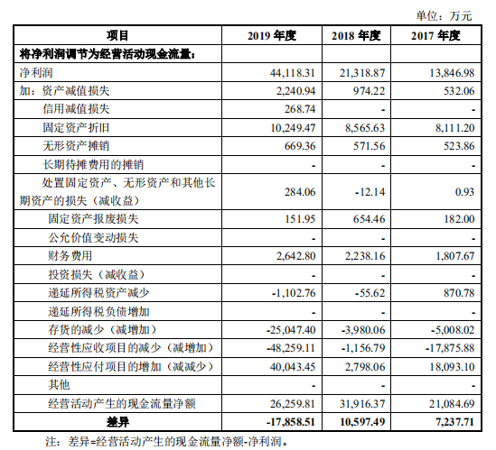 受益于行业红利,近年来生益电子业绩快速提升,但业务的极速扩张也给其发展带来隐忧。报告期内,该公司经营活动产生的现金流净额波动较为明显,分别为2.11亿元、3.19亿元及2.63亿元。值得注意的是,2019年该公司经营活动产生的现金流量净额较之同期净利润的差额已扩大到-1.79亿元。