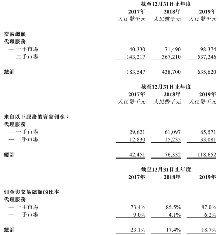 从卖家佣金的情况来看,报告期内,一手市场的卖家佣金分别为2962万元、6110万元和8557万元,二手市场的佣金分别为1283万元、1524万元和3308万元,一手市场上卖家佣金占交易总额的比例分别为73.4%、85.5%和87.0%,占比较高。