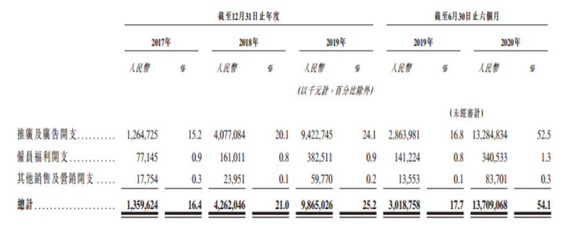 2020年上半年,快手销售及营销开支骤增至137.09亿元,较去年同期的30.18亿元增长3.5倍,远超2019年全年额度,占总营收的比重也剧增至54.1%