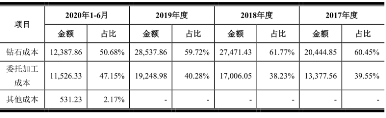 报告期内,迪阿股份钻石成本金额分别为2.04亿元、2.75亿元、2.85亿元和 1.24亿元,2018年与2019年增长率分别为34.37%与3.88%;委托加工成本金额分别为1.34亿元1.7亿元、1.92亿元和1.15亿元,2018年与2019年增长率分别为27.12%与13.18%。2018年随着公司销售收入的快速增长,钻石成本与委托加工成本增长率均相对较高,而且委托加工的涨幅更高。