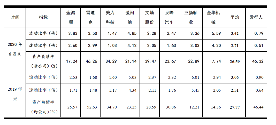 报告期各期末,该公司流动比率分别为1.71、0.85、0.9和0.79,速动比率分别为1.28、0.57、0.64和0.51,下降明显且远低于同行业可比上市公司平均水平。同时,其母公司资产负债率分别为35.43%、45.17%、46.44%和46.32%,处于增长态势且远高于同行业可比上市公司平均水平,整体来看,该公司偿债能力低于同行业可比上市公司平均水平。