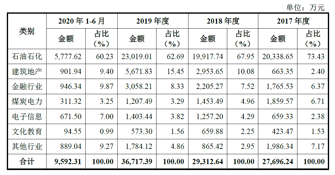 据招股书介绍,该公司已拥有的客户群体包括中国石油、中国石化、中国建筑、中国海油等大型央企;万达集团、新希望集团、龙湖集团等行业龙头企业;以及中国平安、中国人寿、太平洋保险、浦发银行、全国股转公司等金融保险企业。