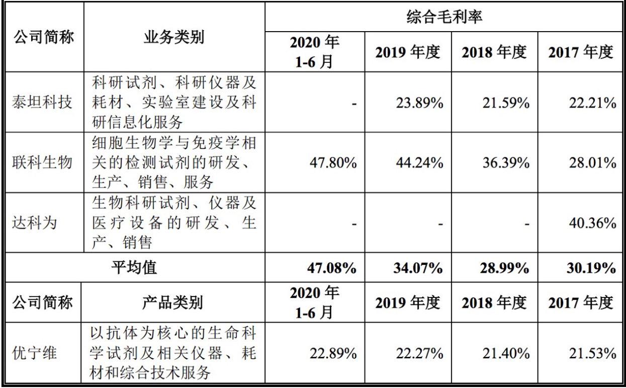 招股书中,该公司将泰坦科技(688133.SH)、联科生物和达科为作为同业可比公司,其中泰坦科技毛利率基本维持在23%上下,联科生物毛利率则从2017年的28%左右逐步攀升至2020年上半年的48%,增长较快。而达科为2017年毛利率为40.36%,因2019年2月该公司已在全国中小企业股份转让系统终止挂牌,因此未披露2018年及2019年报。