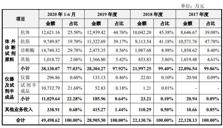 针对2020年上半年该公司营业收入及净利润大幅增加的问题,招股书解释到,除了传统项目维持较高增长水平以外,2020年疫情暴发以来,该公司作为分子新冠检验试剂及抗原抗体新冠检验试剂核心原料供应商,响应市场需求,开发出一系列新冠病毒相关的酶、抗体、抗原等试剂原料及相应的试剂产品,被国内外体外诊断试剂客户大量采购,相关收入增长显著。