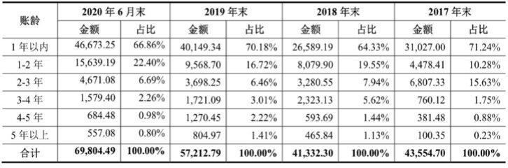 从应收账款账龄来看,该公司1年以内应收账款余额占应收账款余额比重分别为71.24%、64.33%、70.18%和66.86%,1年以上的应收账款余额占应收账款余额比重分别为28.76%、35.67%、29.82%和33.14%,占比较高。