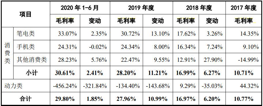 招股书中解释称,一方面,公司动力类业务处于布局阶段,相关电池产品主要应用于电动摩托、汽车启停系统等领域;另一方面,自2019年下半年起,公司将动力类与消费类锂离子电池产线分开,且动力类锂离子电池独立产线尚未形成规模效应,分摊的固定成本较多。