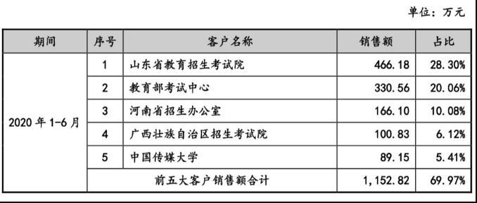 但值得注意的是,中国证券业协会一直都是鸥玛软件的第一大客户,2017年至2019年,中国证券业协会为鸥玛软件贡献的销售额分别为5396.86万元、4060.23万元、3504.48万元,在前五大客户销售总额中占比分别为37.0%、24.23%、20.05%。但时至2020年上半年,中国证券业协会并未列入该公司的前五大客户之中,随之消失的还有中国房地产估价师与房地产经济人学会和住房和城乡建设部执业资格注册中心,转由河南省招生办公室、广西壮族自治区招生考试院、中国传媒大学顶替进来,前五大客户更换了三个。