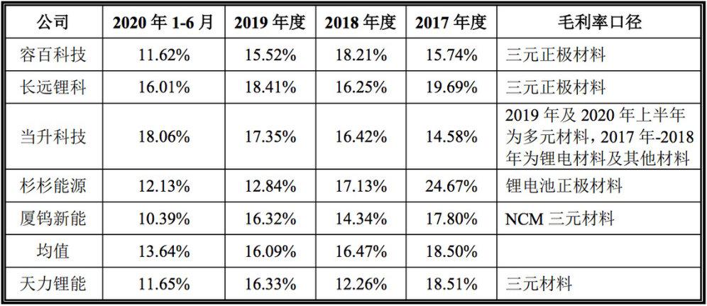 从毛利端来看,报告期内,该公司主营业务(三元材料产品)的毛利率亦一路波动下行,分别为18.51%、12.26%、16.33%和11.65%,且总体低于同行业可比公司平均水平。