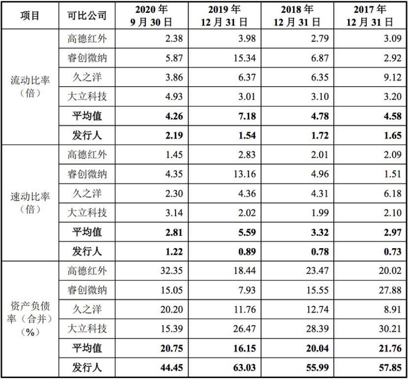 《投资时报》研究员查阅该公司招股书数据发现,2017年—2019年及2020年前三季度(下称报告期),富吉瑞资产负债率分别达到57.85%、55.99%、63.03%和44.45%,总体处于一路走高趋势,并且远高于同行业仅徘徊在20%的平均负债率。此外,报告期内,该公司流动比率和速动比率均低于同行业公司的平均水平。