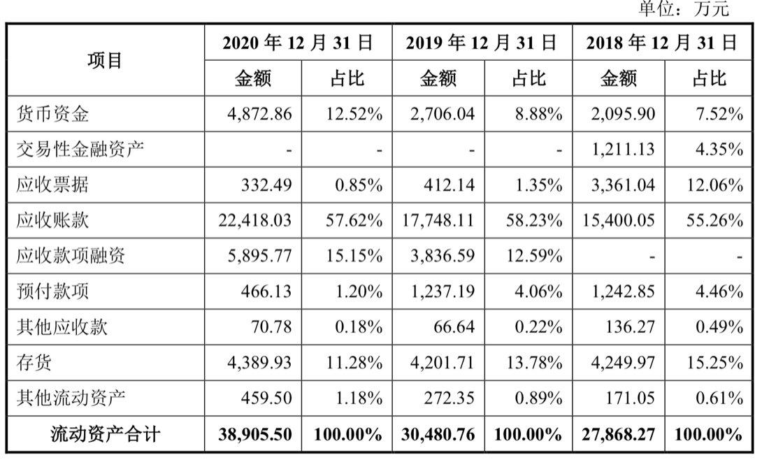据招股书披露,报告期内该公司应收账款逐年增加,分别为1.54亿元、1.77亿元和2.24亿元,占流动资产的比例分别为55.26%、58.23%和57.62%;应收账款余额占当期营业收入比例分别为35.81%、36.81%和40.74%,其中2018年、2019年占比相对稳定,2020年占比上升较大。