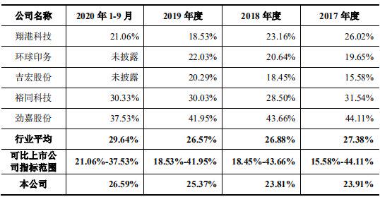 而且,印刷企业的产品订单完全取决于下游厂商的需求,是典型的“下游驱动”行业。印刷企业受制于上下两端,利润率单薄。这一特征在中荣股份身上表露无遗。据招股书显示,报告期内,该公司综合毛利率分别为23.91%、23.81%、25.37%及26.59%,低于可比上市公司平均水平。