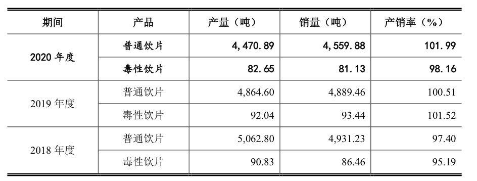 而就目前至信药业产销量方面的数据来看,似乎并未按其预期向好的趋势发展。报告期内,该公司普通饮片的产量分别是为5062.80吨、4864.60吨、4470.89吨,呈逐年递减趋势。即便是加上毒性饮片的生产,至信药业中药饮片的产量合计分别为5153.63吨、4956.64吨、4553.54吨,销量仍然下滑明显。