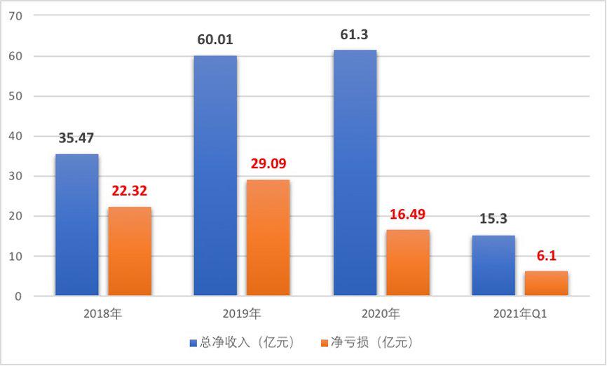 但是营收增长仍难解不盈利难题。据招股书数据披露,2018年至2020年该公司一直处于亏损态势,且净亏损额分别高达22.32亿元、29.09亿元和16.49亿元,三年累计亏损67.90亿元。时至2021年,该公司亏损态势仍未有转变,首季净亏6.10亿元,相较上年同期1.95亿元净亏损额,亏损规模进一步扩大。