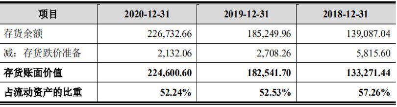 此外,招股书显示,报告期各期末,该公司存货账面价值分别为13.33亿元、18.25亿元和22.46亿元,占流动资产的比例分别为57.26%、52.53%和52.24%,均超过50%。