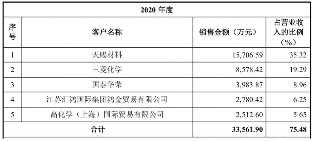 报告期间,华盛锂电向前五大客户的销售金额分别为2.61亿元、3.32亿元和3.36亿元,占当期营收的比例分别为70.57%、78.45%和75.48%。其中,天赐材料和三菱化学长期居该公司五大客户前列,2020年销售占比分别为35.32%和19.29%,合计占比已超出该公司全年营收的50%。可见,华盛锂电对下游行业需求依赖程度较高。