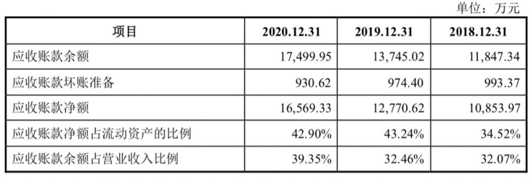 据招股书信息可知,报告期内,华盛锂电应收账款净额较高且逐年递增,分别为1.09亿元、1.28亿元和1.66亿元,占期末流动资产的比例分别为34.52%、43.24%和42.90%,且应收账款占各期营收的比重逐渐扩大,分别为32.07%、32.46%和39.35%。2020年,该公司度应收账款增速为29.69%,高于其同期5.2%的营收增速,应收账款已计提坏账准备930.62万元。