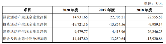 同时,2020年该公司经营活动现金流净额下降明显。2018至2020年该公司经营活动净现金流分别为2.26亿元、2.27亿元、1.49亿元。招股书中对此的解释为2020年度经营活动产生的现金流量下降,主要系在客户回款金额较为平稳的情况下,公司当年支付供应商款项及当期支付税费增加。