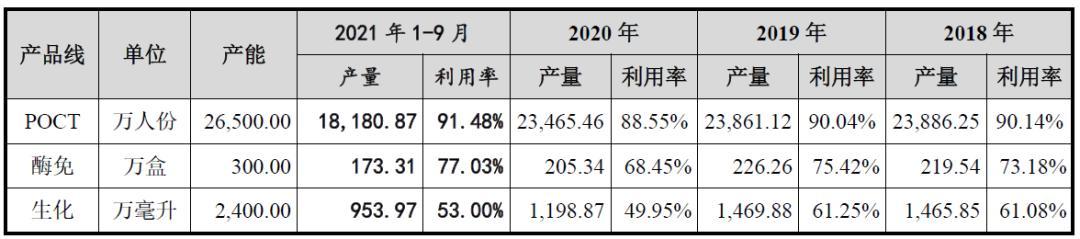 招股书披露信息显示,本次募集资金中有约25%将用于体外诊断产品生产基地建设项目。但是,《投资时报》研究员从招股书中看到,报告期内,公司三条主要生产线POCT产品线、酶免产品线及生化产品线的产能利通率均基本不足90%,除POCT产品线外,其他两条产品线产能利用率甚至在75%以下。在此背景下,仍募资扩建产品线必要性值得商榷。