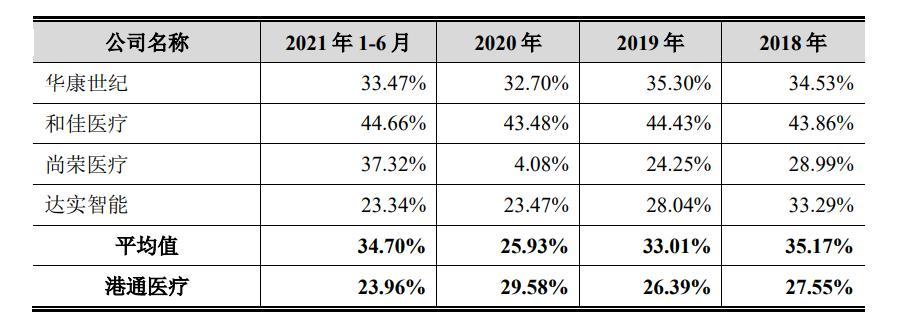 2018年和2019年,港通医疗营收净利双双保持快速增长,且增长幅度逐年提高,但该公司的毛利率却始终低于同行业均值,且2021年出现小幅下降。