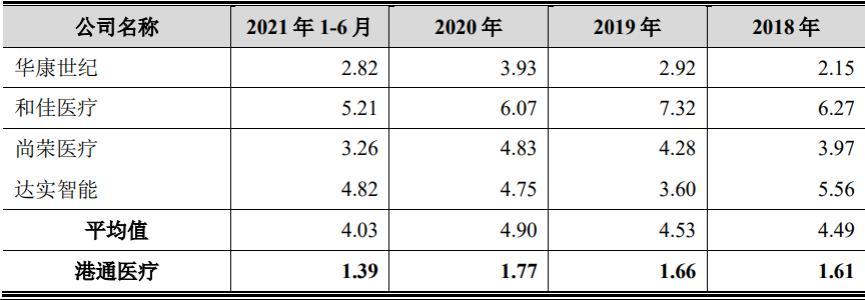 在衡量企业变现能力的另外两个指标上,港通医疗也表现得并不乐观。报告期内,港通医疗的流动比率分别为1.67、1.71、1.68和1.63,速动比率分别为1.13、1.15、1.18和1.08。而同期,流动比率同行业均值为2.05、2.19、2.22和2.39,速动比率同行业均值为1.79、1.95、2.01和2.13,低于同行业均值水平。