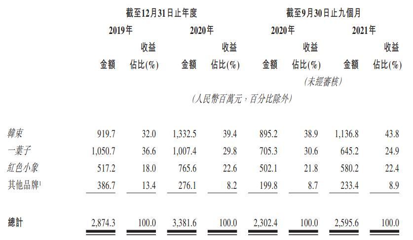 可以看到,韩束的营收占比呈现增长趋势,2021年前三季度占比已达43.8%,几乎支撑起了该公司近一半的营收,明显高于一叶子、红色小象营收占比。