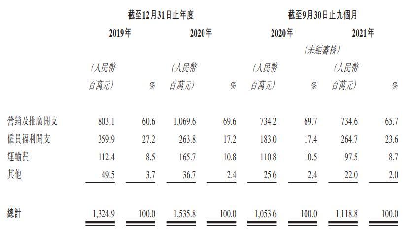 从销售费用的明细可以看到,该公司各期营销及推广开支分别为8.03亿元、10.70亿元、7.35亿元,占营销费用的比例均超过六成。